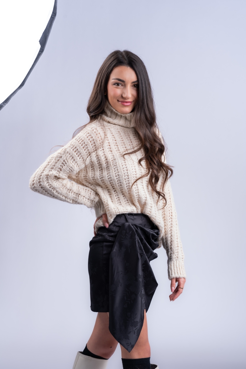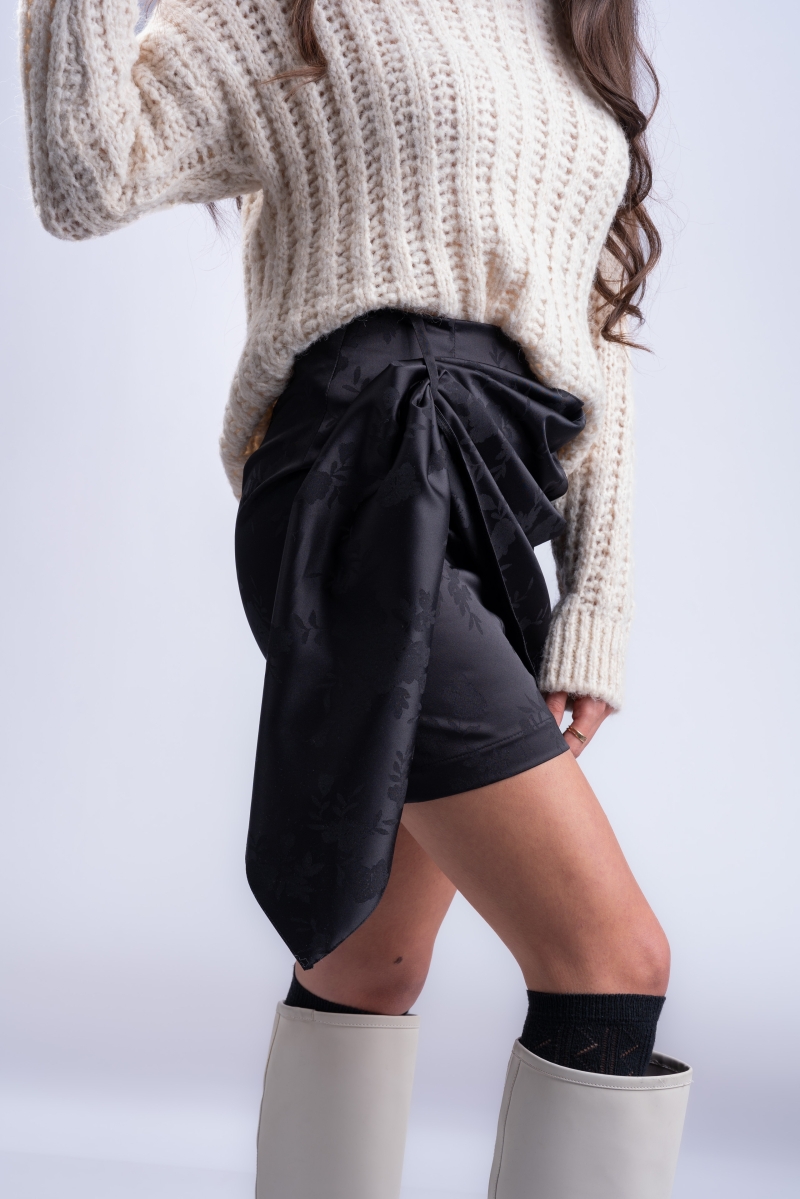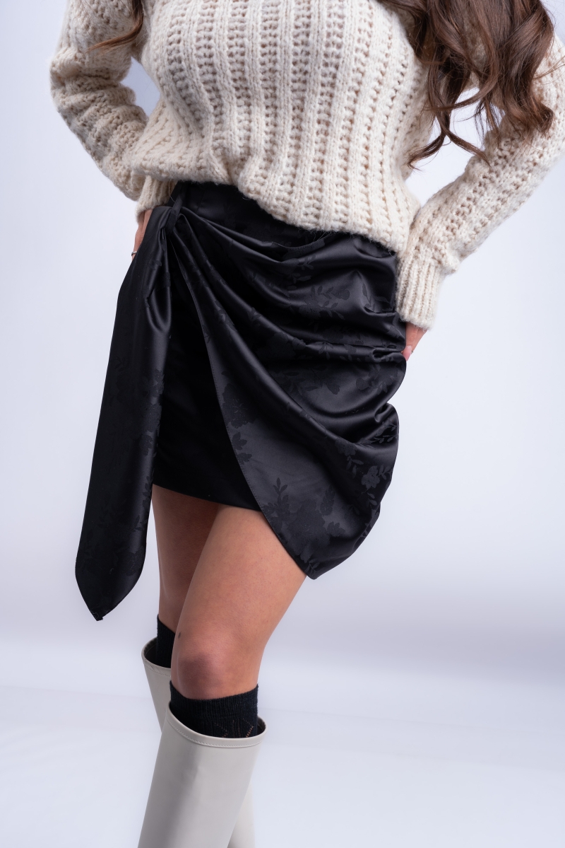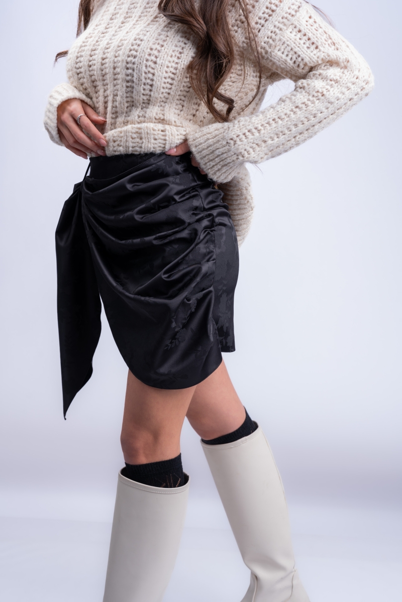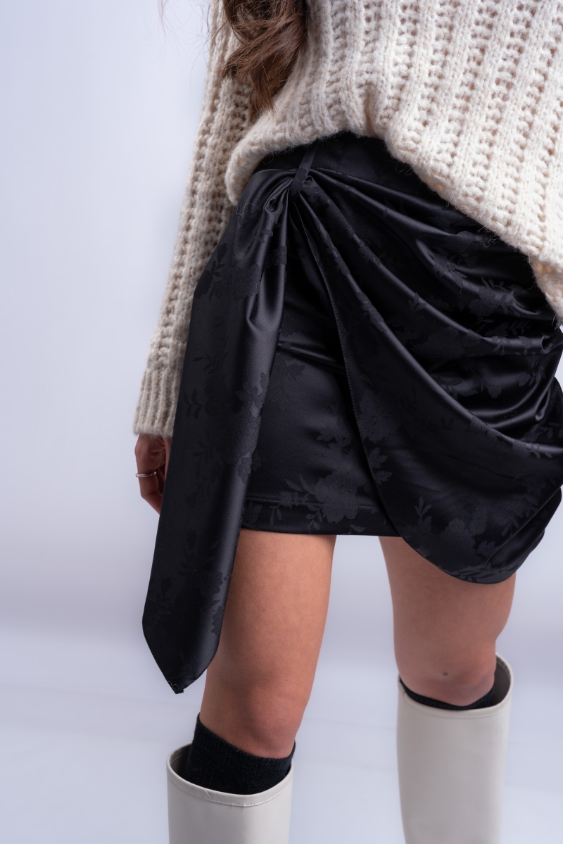 Дамска къса пола, интересен, разчупен и нестандартен модел. Модела е с висока талия, закопчаване с цип в задната част и малка цепка. Изработена е от изключително красив сатен на ефекти- матови цветя. Полата е подходяща за елегантна, както и спортно-елегантна визия.